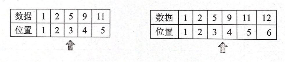 1,2,5,9,11,还有一组数据是1,2,5,9,11,12。他们分别的中位数如下示意图所示。